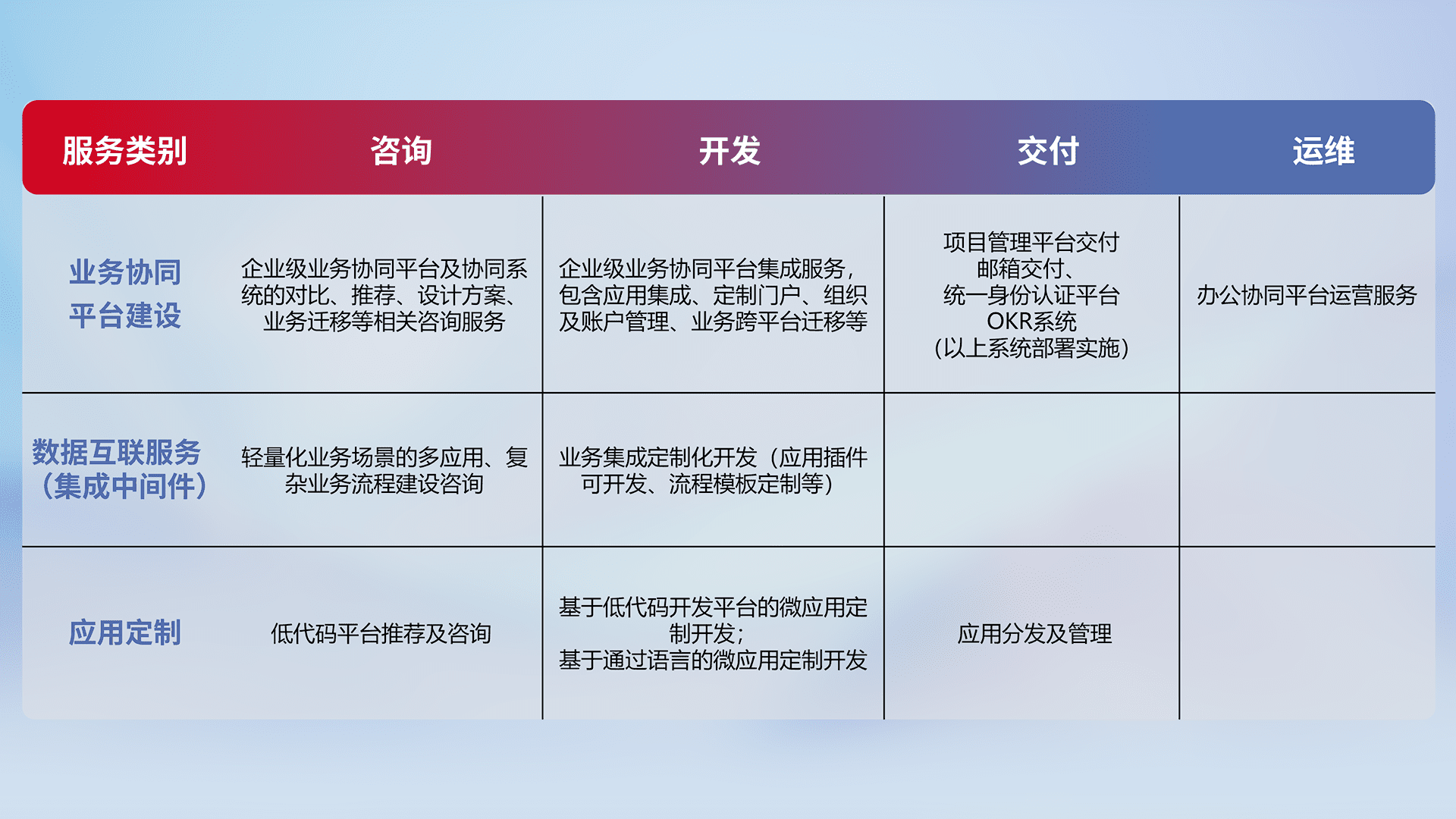针对钉钉、、企微、、IDaas等平台级产品提供产品的规划、、方案、、、交付、、定制化开发等服务,,实现如统一协同办公、、智能客户服务、、、、混合会议管理、、智能数据查询、、等业务场景,,,,实现数字化转型。。