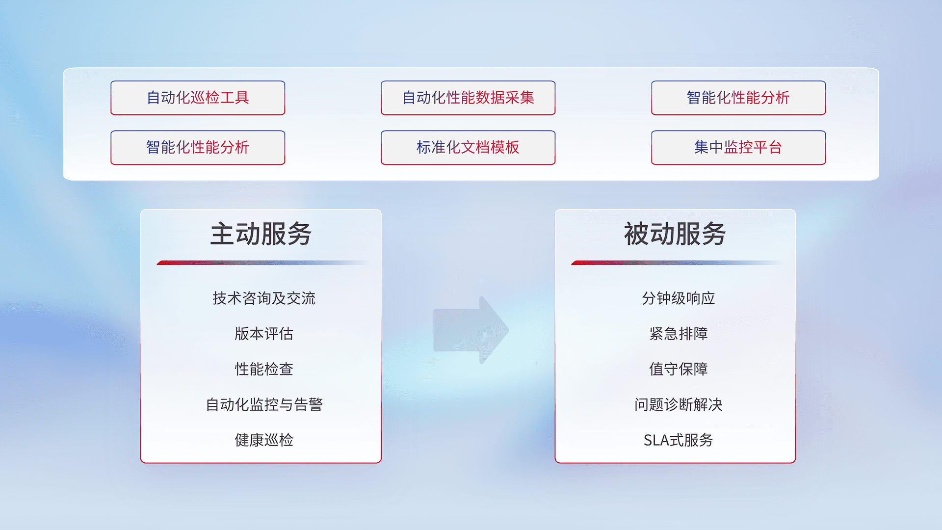 智能化工具和标准化文档,,,,保障服务质量,,,,提供主动服务(包含技术咨询、、、版本评估、、、性能检查、、、、自动化监控与告警、、、健康巡检)和被动服务包含(分钟级响应、、紧急排障、、、、值守保障、、、、问题诊断解决、、、、SLA服务)。。