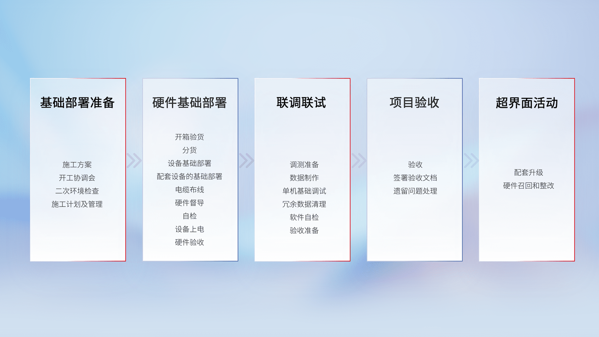 从基础部署准备、、硬件基础部署、、联调联试、、项目验收、、、越界面活动的全过程可追溯,,,,保证施工质量和进度。。。。